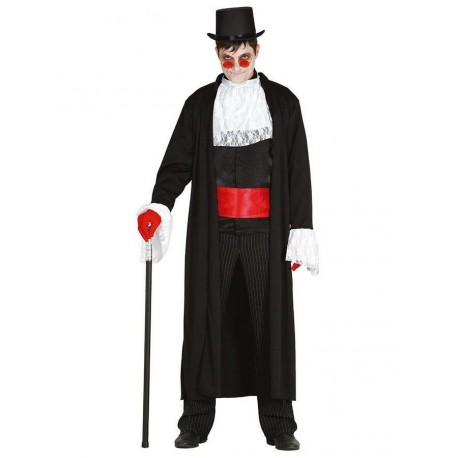 COSTUME HALLOWEEN CONTE DRACULA ADULTO TAGLIA UN.MANTELLO LUNGO CINTURA ROSSA E COLLO DI PIZZO BIANCO COME MANICHE
