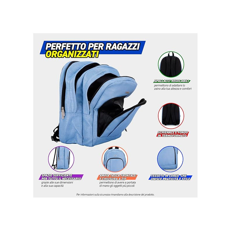 ZAINO SCUOLA ORGANIZZATO COMIX LUREX AZZURRO GLITTER 32X43X23CM 31L 3 ZIP 2 TASCHE CON ZIP PANINI SCUOLA ITALY